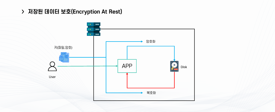 유저가 어플리케이션에 파일을 업로드하면 디스크에 암호화 상태로 저장하고, 복호화시 키가 필요한 기술