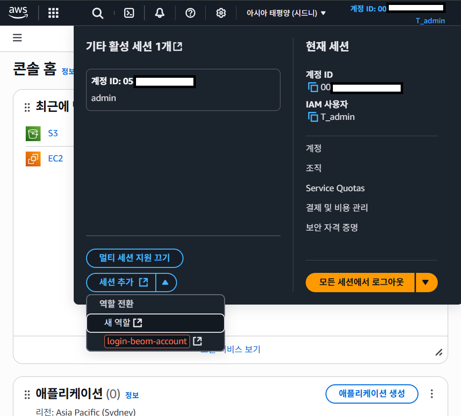 AWS 서비스 중 하나인 멀티 세션을 이용하면 세션 만료없이 두개 이상의 계정을 관리할 수 있다.