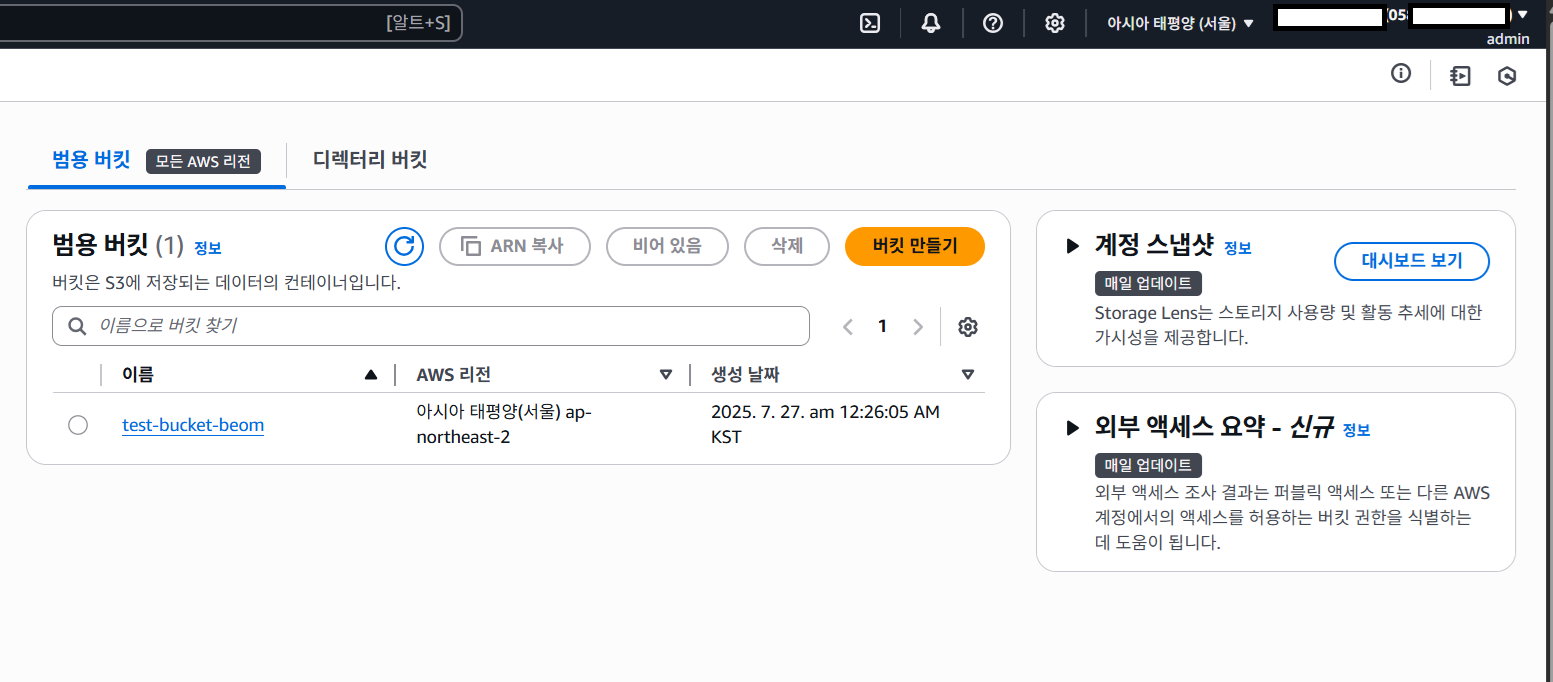 A 계정에 접근했으니, 아까 주어진 AdministratorAccess 권한을 활용해 S3 버킷이 A계정에 만들어지는지 확인해보자