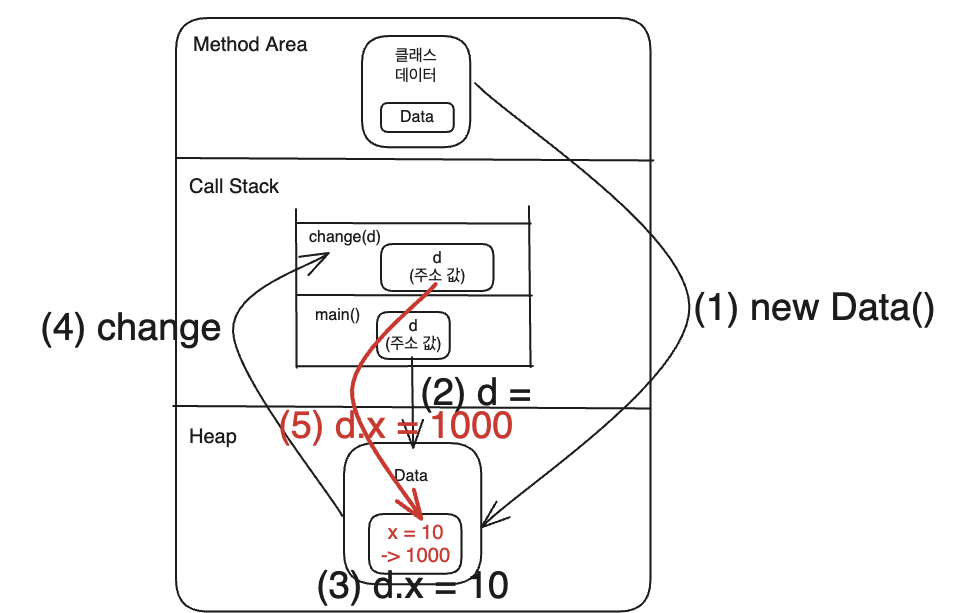new Data()Data d = new Data()d.x = 10다음은 call by reference 이다.
