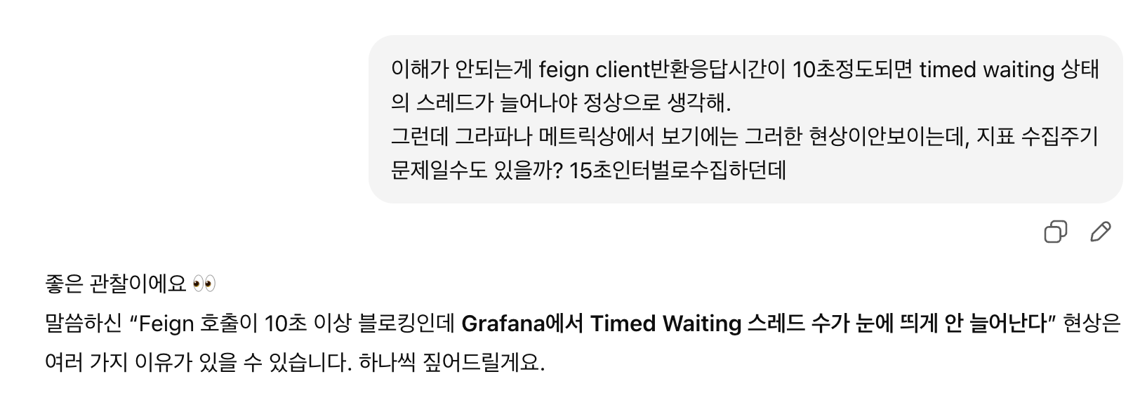 그래서 나의 공부 친구 GPT랑 티키타카좀 했다. (처음에는 metric 수집 지표가 15초주기 간격이라 블랙박스때문에 timed waiting 스레드가 수집되지 않는 것이 아닐까 생각했다.)