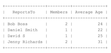 In this MySQL challenge, your query should return the names of the people who are reported to (excluding null values), the number of members that report to them, and the average age of those members as an integer. The rows should be ordered by the names in alphabetical order. Your output should look like the following table.
