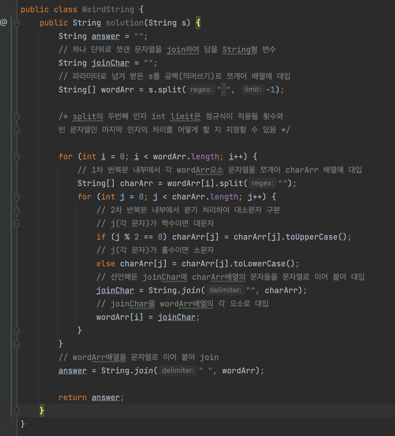 - 문자열 전체의 짝/홀수 인덱스가 아니라, 단어(공백을 기준)별로 짝/홀수 인덱스를 판단해야합니다.