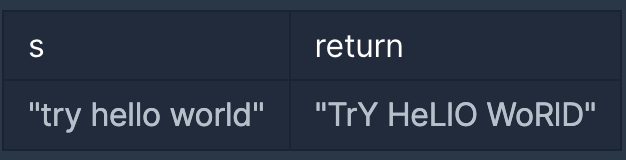 "try hello world"는 세 단어 "try", "hello", "world"로 구성되어 있습니다. 각 단어의 짝수번째 문자를 대문자로, 홀수번째 문자를 소문자로 바꾸면 "TrY", "HeLlO", "WoRlD"입니다. 따라서 "TrY HeLlO WoRlD" 를 리턴합니다.