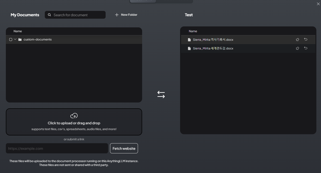 - 워크스페이스명 옆의 업로드 버튼을 클릭해 RAG 가 참조하게 만들 데이터를 제공할 수 있음.