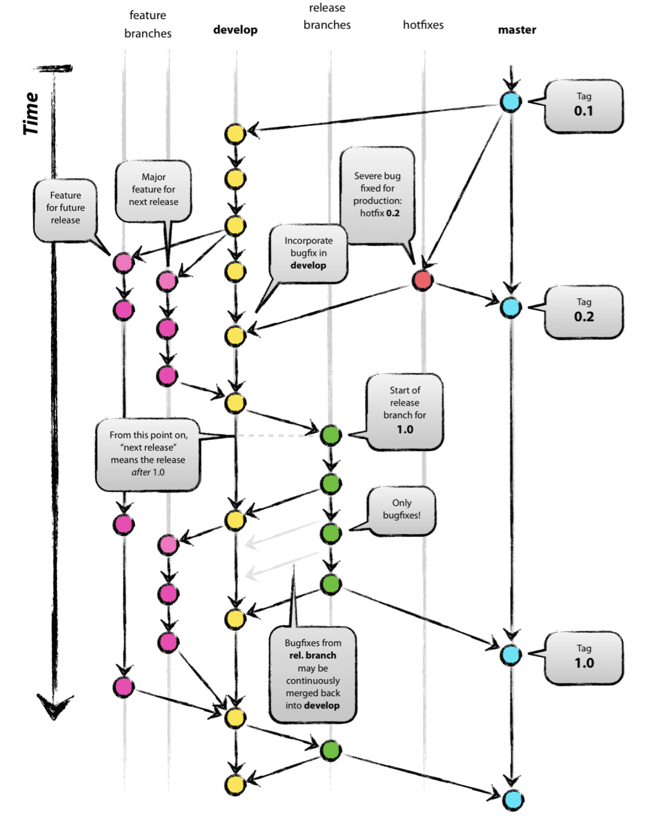 항상 유지되는 메인 브랜치들(master, develop)과 일정 기간 동안만 유지되는 보조 브랜치들(feature, release, hotfix)이 있다.