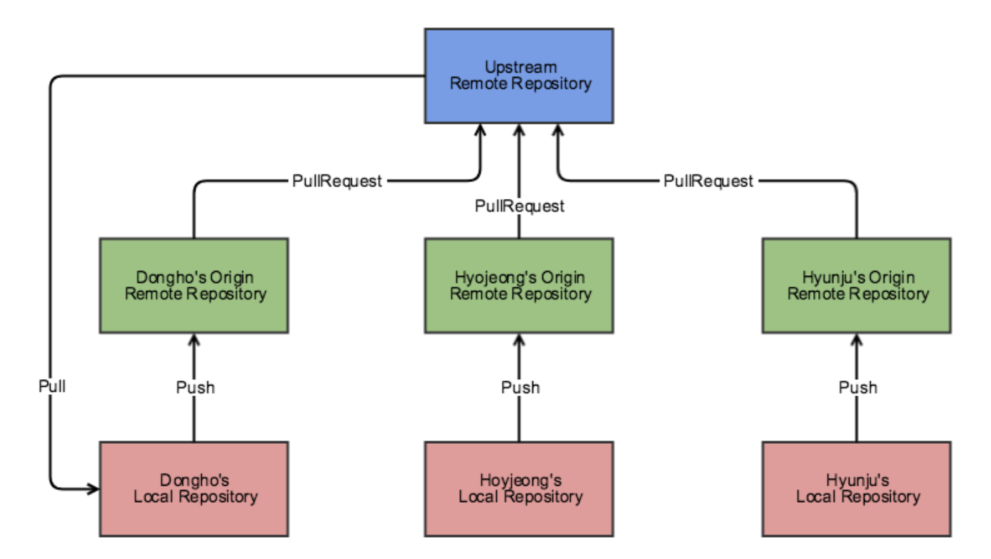 Repository는 Upstream Remote Repository, Origin Remote Repository, Local Repository 3부분으로 구성된다.