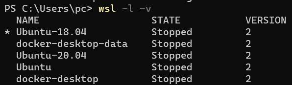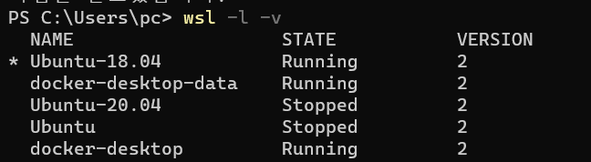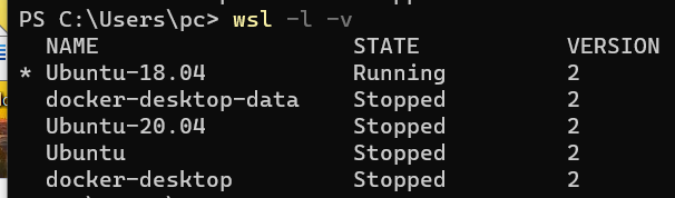 windows terminal(또는 PowerShell)에서 wsl -l -v를 통해 상태를 확인해볼 수 있다.