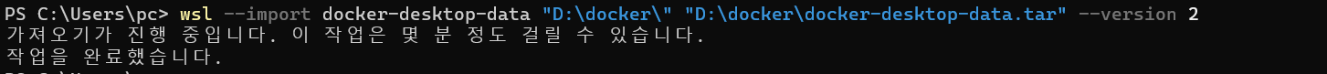 wsl --import docker-desktop-data "D:\docker\" "D:\docker\docker-desktop-data.tar" --version 2