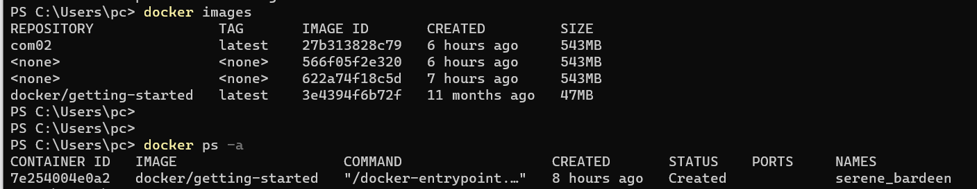 그 후 docker images와 docker ps -a를 해보면 원래 있었던 것들이 잘 드는 것을 확인할 수 있다.
