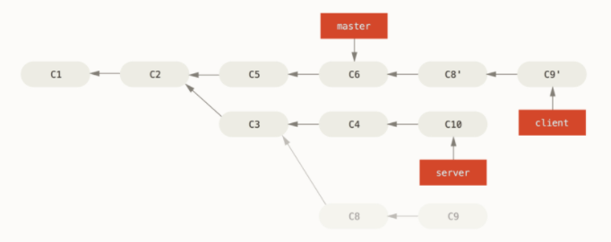 server 와는 아무 관련이 없는 client 커밋은 C8, C9 이다. 이 두 커밋을 master 브랜치에 적용하기 위해서 --onto 옵션을 사용하여 아래와 같은 명령을 실행한다