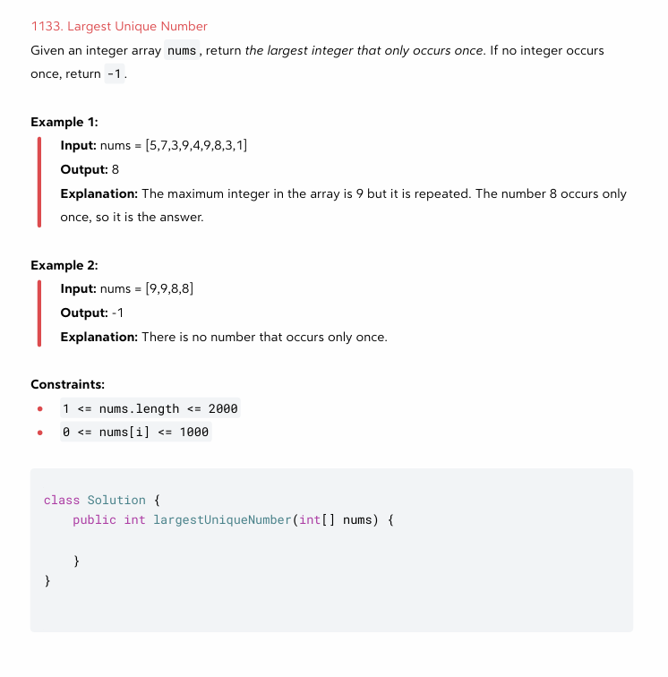 public int largestUniqueNumber(int[] nums) {