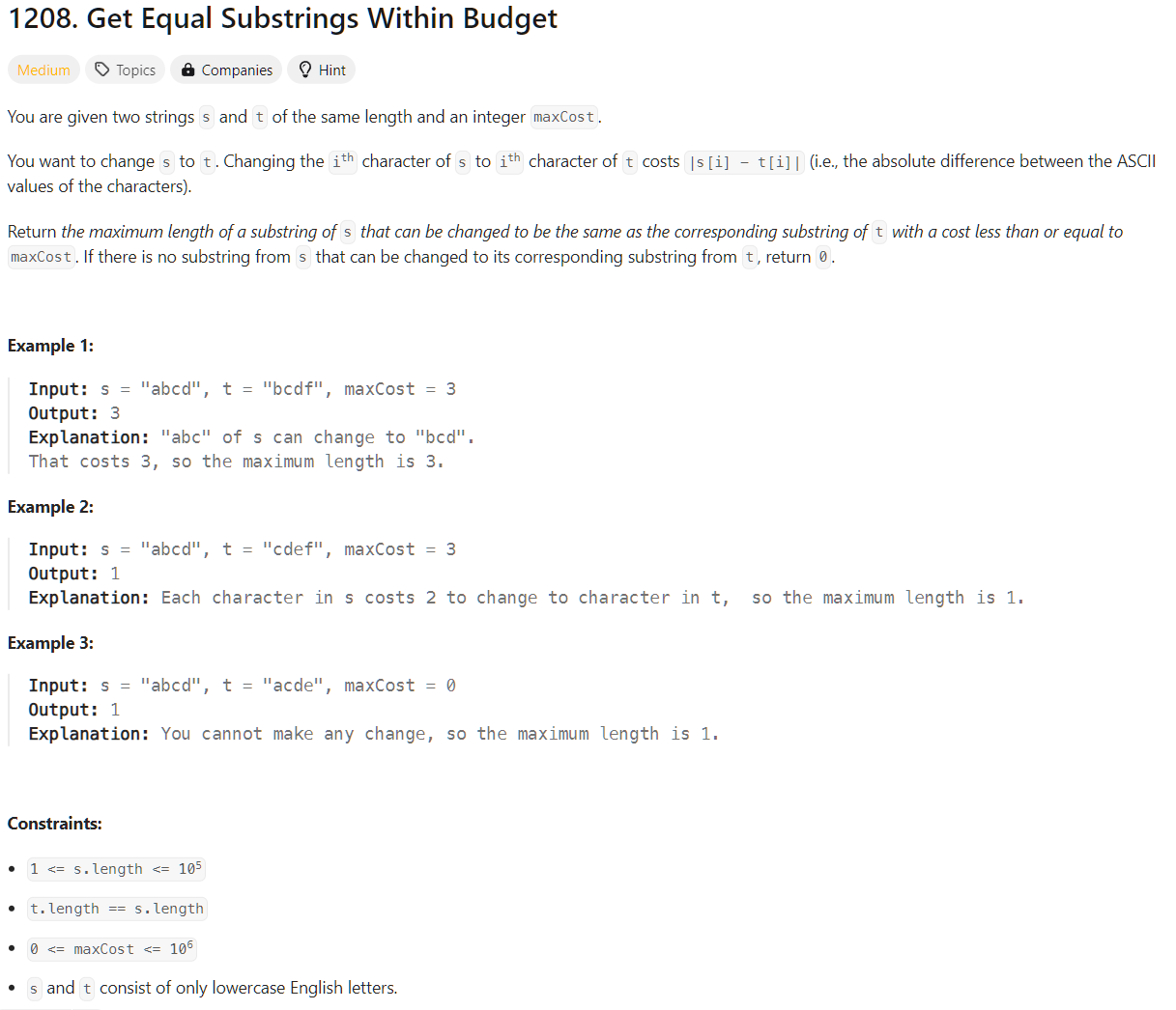 https://leetcode.com/problems/get-equal-substrings-within-budget/description/
