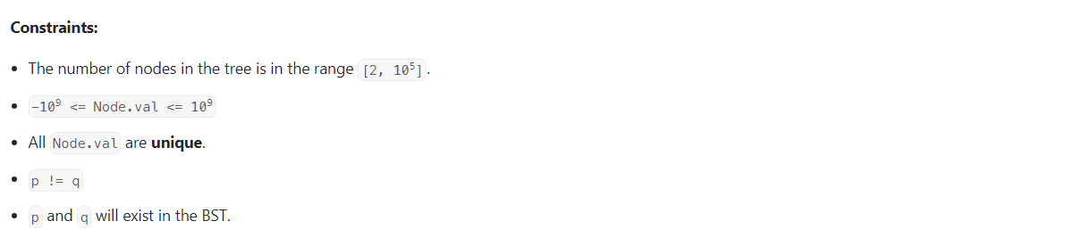 - BST 특성상, p와 q가 분기되는 최초의 노드가 두 노드가 만나는 가장 낮은 조상이다.