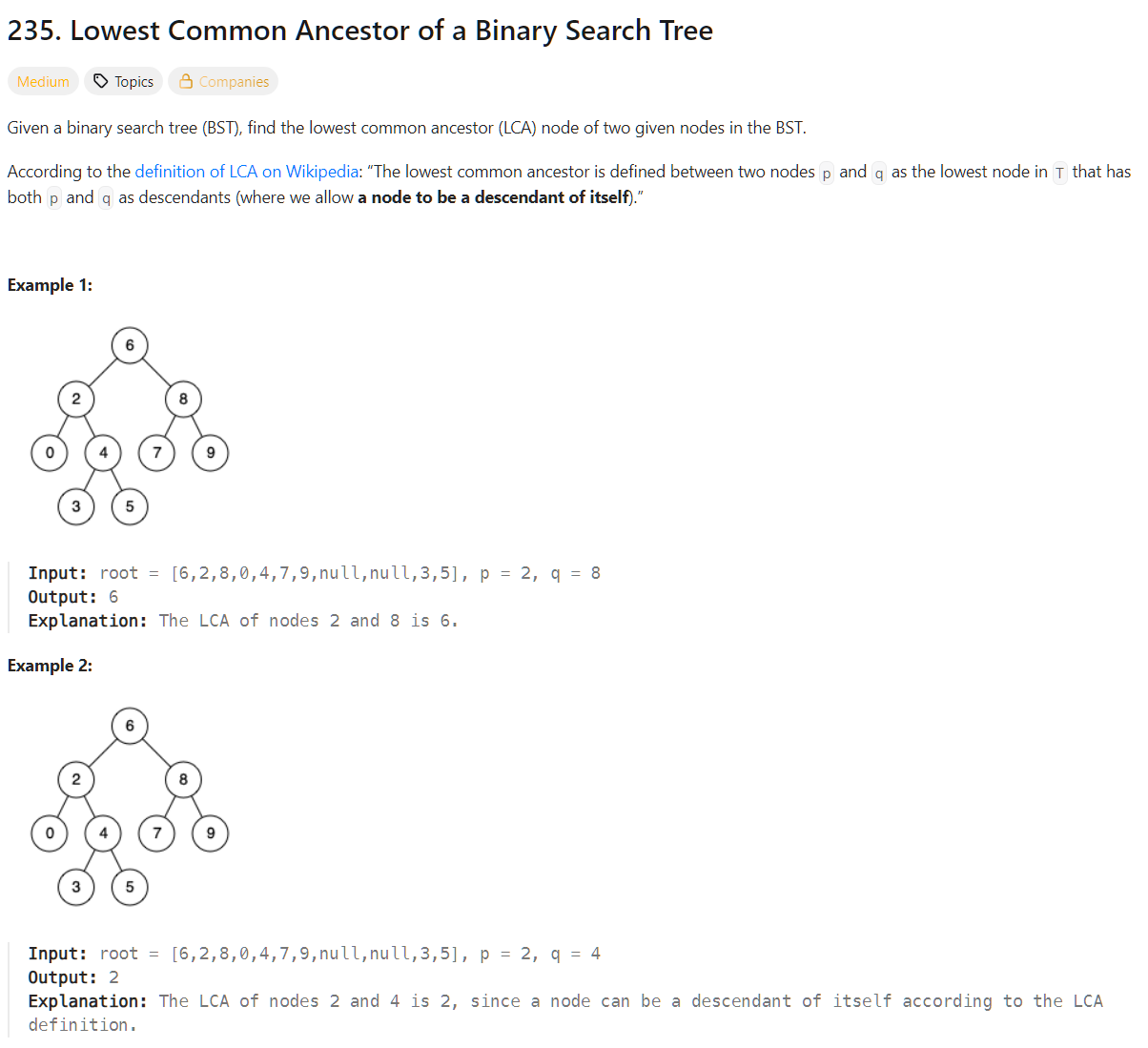 - p, q 중 큰 값과 작은 값을 찾아서, 그 사이에 있다면 root / 없다면 오른쪽 or 왼쪽 탐색