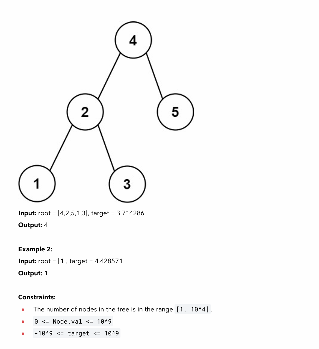 - target > node.val 이라면 target을 더 가까운 값은 현재 root 노드 또는 오른쪽에만 존재하므로 root.right 탐색