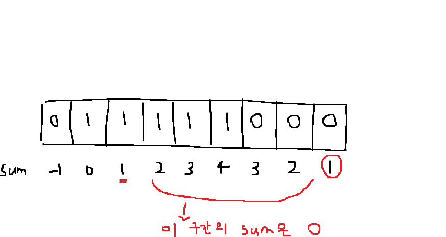 0인 경우에 -1, 1인 경우에 +1을 해주면 손쉽게 0과 1의 개수를 계산할 수 있음