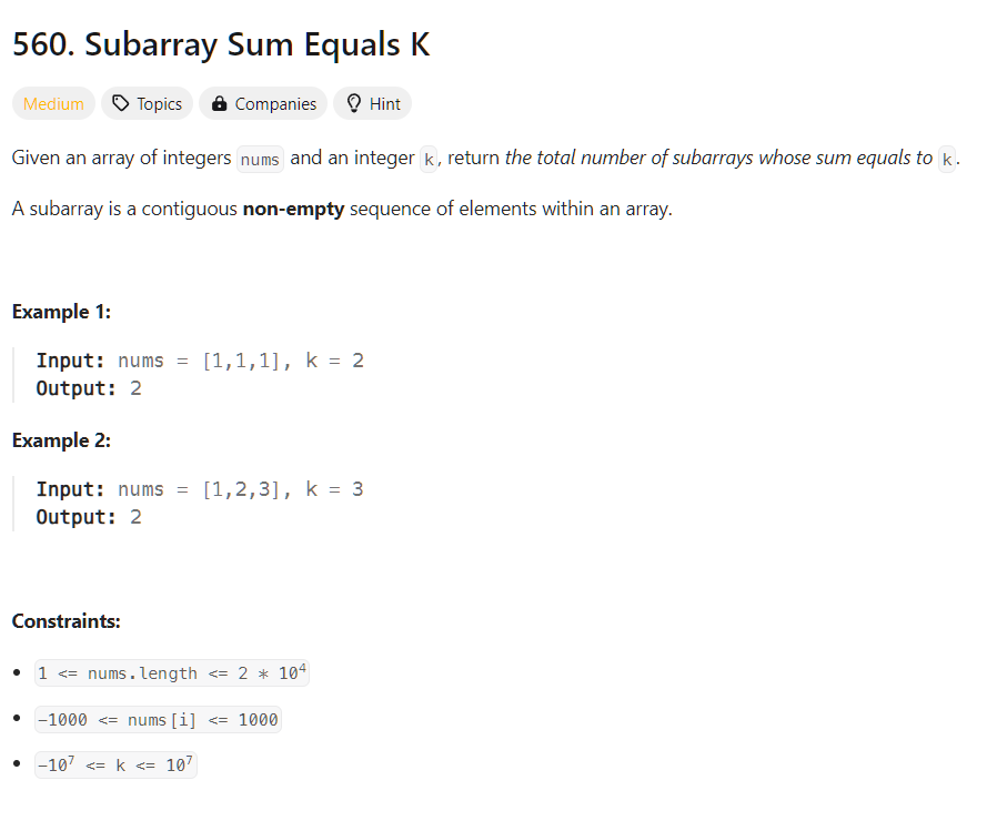 https://leetcode.com/problems/subarray-sum-equals-k/description/