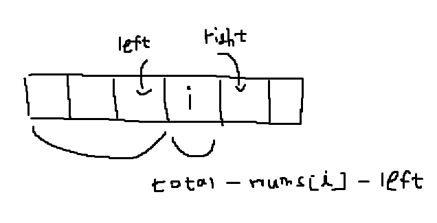 int rightSum = i == nums.length-1 ? 0 : totalSum - leftSum - nums[i];