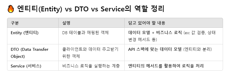 - Controller가 Entity를 직접 다루지 않도록 보호 (Entity 구조 캡슐화).