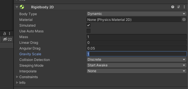 - Gravity Scale을 0으로 설정하여 중력의 영향을 받지 않도록 합니다.