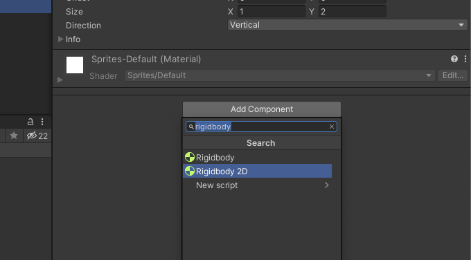- Add Component 버튼을 클릭하고 "Rigidbody 2D"를 검색하여 추가합니다.