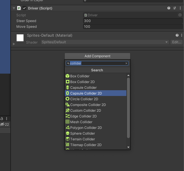 - 여러 가지 옵션이 나타나는데, 우리는 2D 게임을 만들고 있으므로 Capsule Collider 2D를 선택하겠습니다.