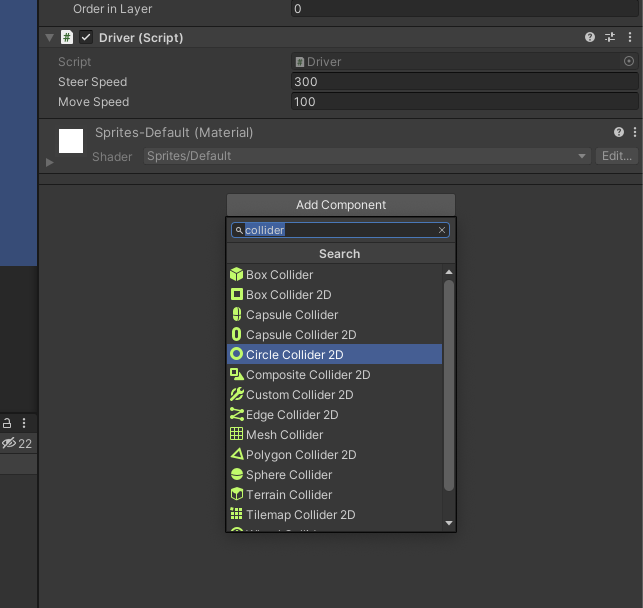 - 원형 스프라이트이므로 Circle Collider 2D를 선택합니다. 만약 사각형 스프라이트를 사용했다면 Box Collider 2D를 선택하면 됩니다.