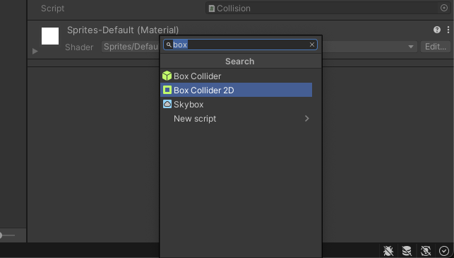 - 이제 Box Collider 2D 컴포넌트를 추가합니다. "Add Component" 버튼을 클릭하고 "Box Collider 2D" 를 검색하여 추가합니다.