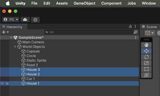 - Hierarchy 창에서 집 오브젝트들을 모두 선택합니다.