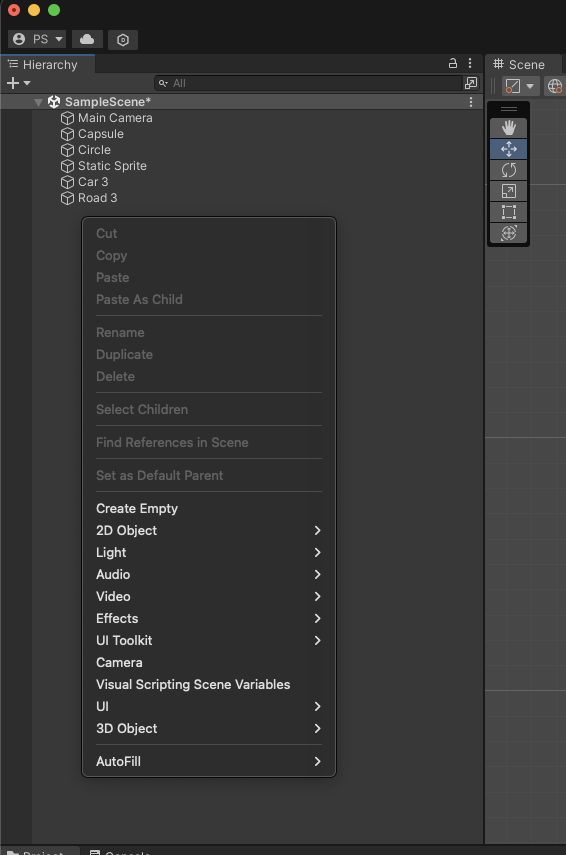 - Hierarchy 창에서 우클릭하고 "Create Empty" 를 선택하여 빈 게임 오브젝트를 생성합니다.