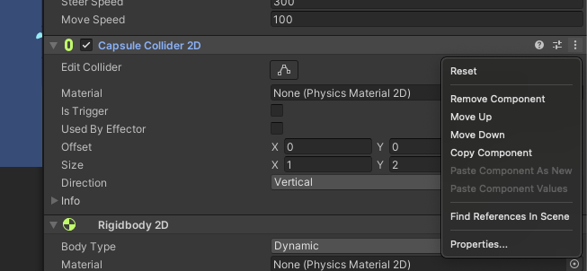 - 나무 오브젝트의 경우 "Circle Collider 2D" 를 사용하는 것이 더 적합할 수 있습니다. 나무들을 선택하고 Circle Collider 2D 를 추가합니다.