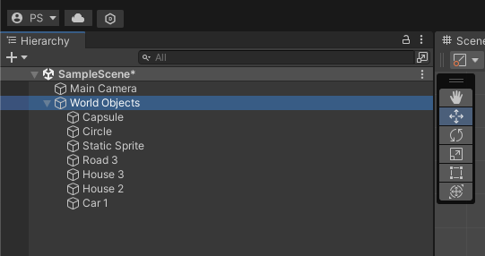 - "World Objects" 오브젝트를 접으면 하위 오브젝트들이 숨겨져 Hierarchy 창이 깔끔해집니다.