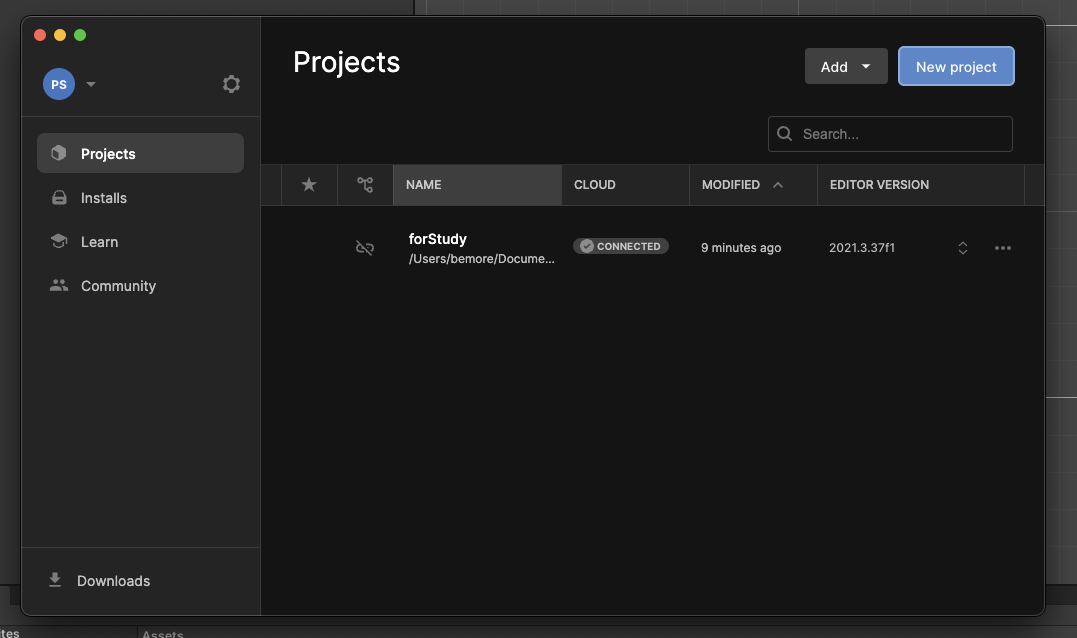 새 프로젝트 생성: 화면에서 New 버튼을 클릭합니다. 만약 여러 버전의 유니티가 설치되어 있다면, New 옆에 있는 화살표를 클릭하여 원하는 버전을 선택할 수 있습니다.