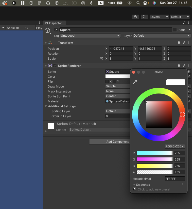 Sprite Renderer 컴포넌트의 Color 옵션을 클릭합니다.