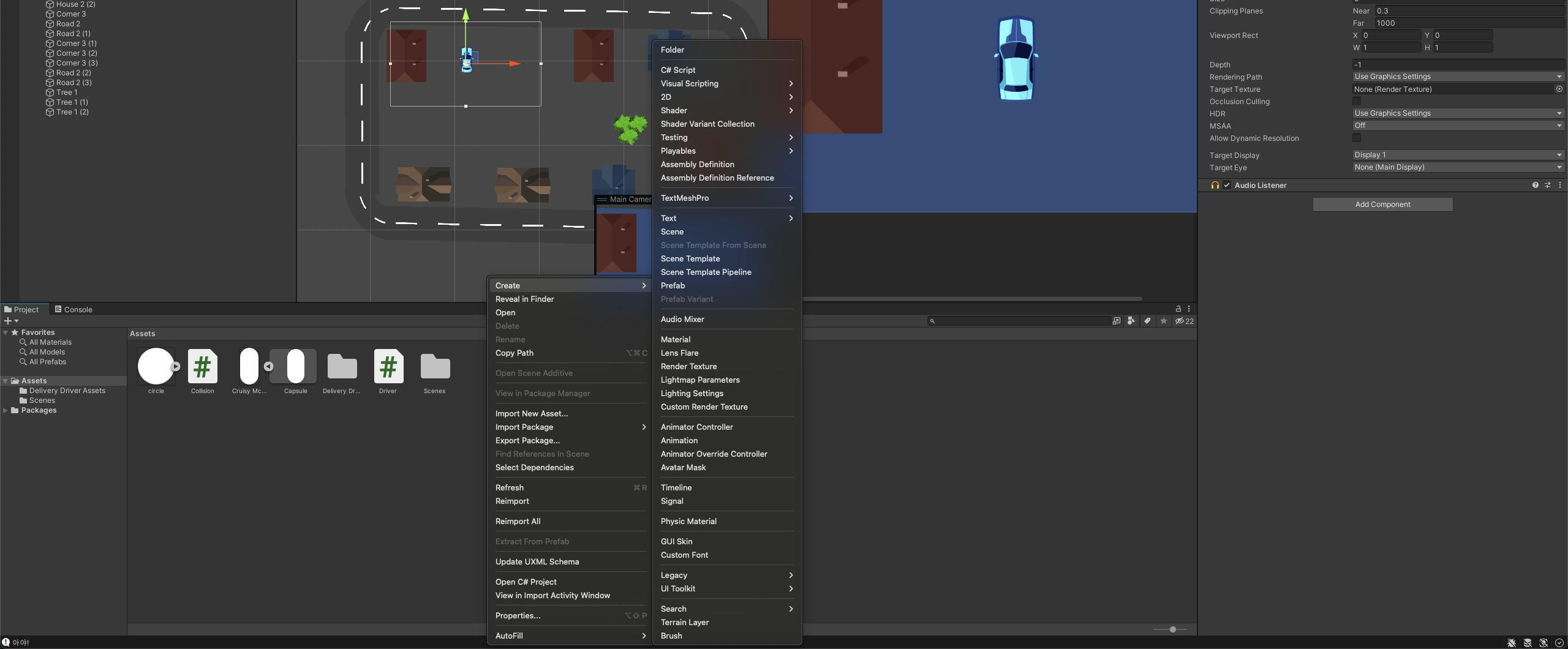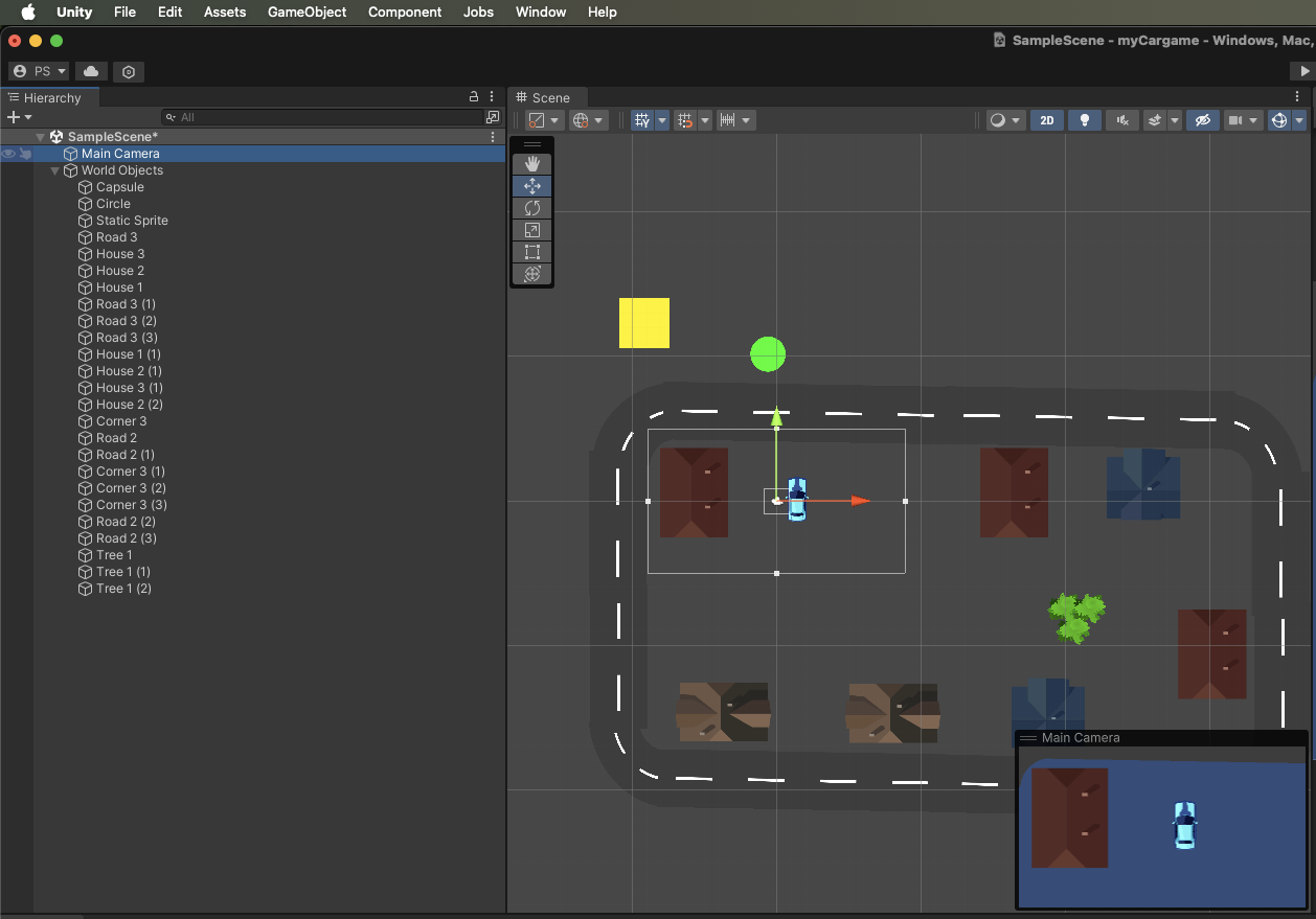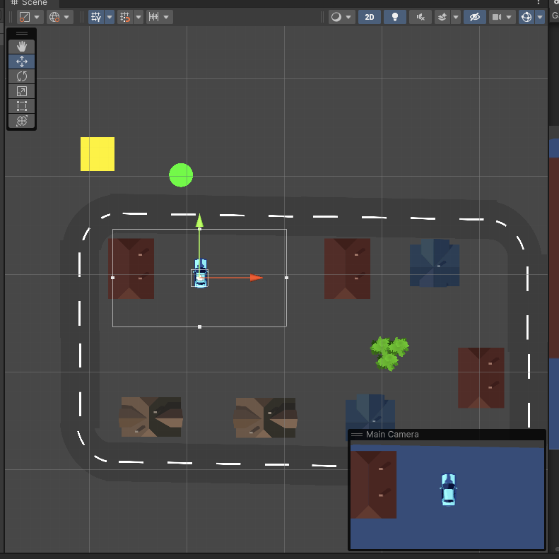 먼저 Unity 프로젝트를 열고, 차량(GameObject)과 메인 카메라가 씬(Scene)에 배치되어 있는지 확인합니다.