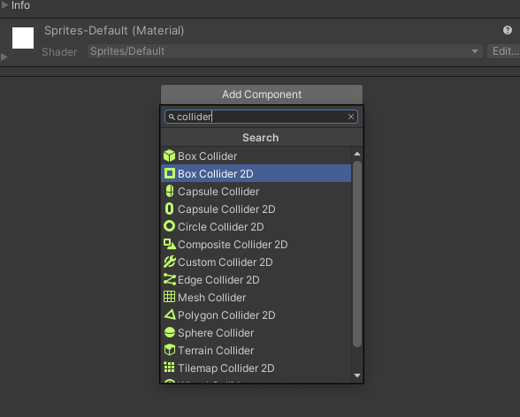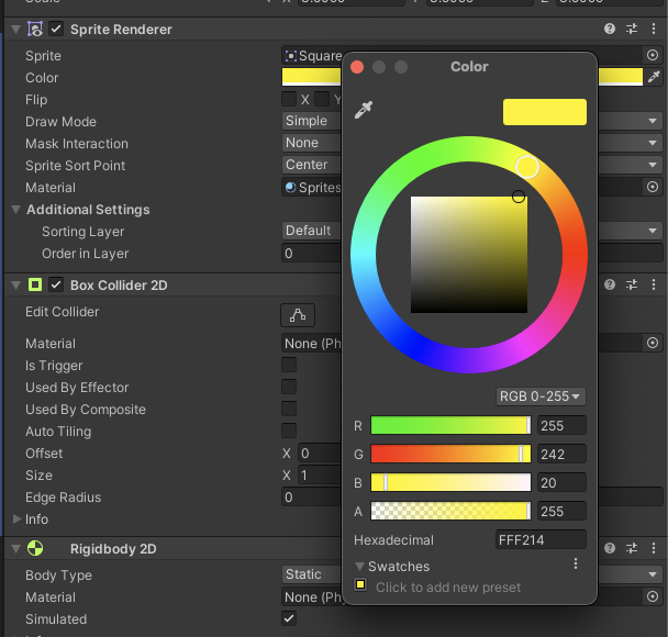 [2D Object] > [Physics] > [Square]를 선택하여 사각형 오브젝트를 생성합니다.