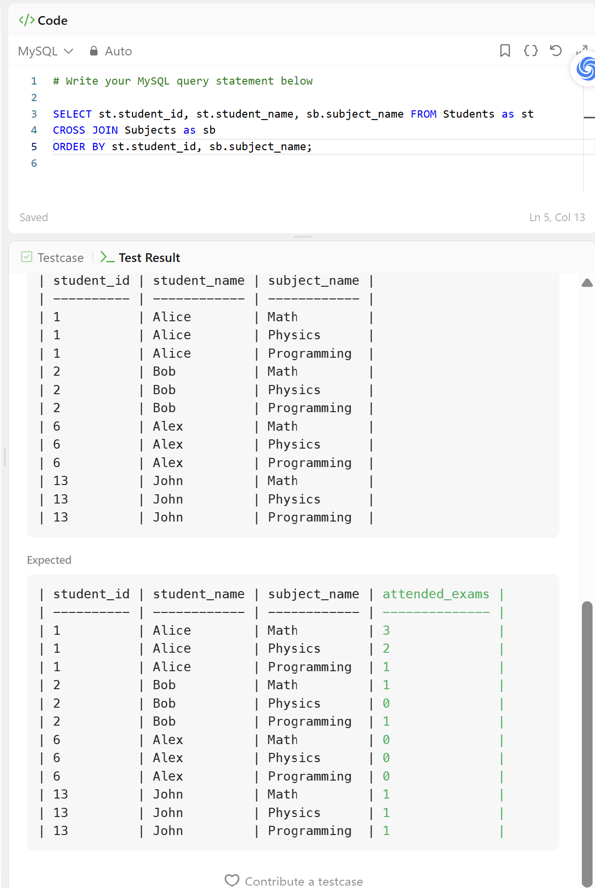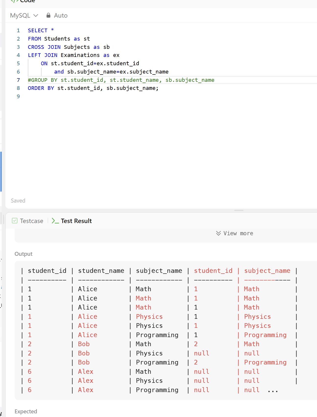 모든 Student는 모든 Subjects에 대한 attended_exams정보를 가져야 한다. 우선 기존에 CROSS JOIN한 Examinations 대신 Subjects로 하여 결과 테이블의 토대를 만들고, ORDER BY를 이용해 정렬을 따라주자.