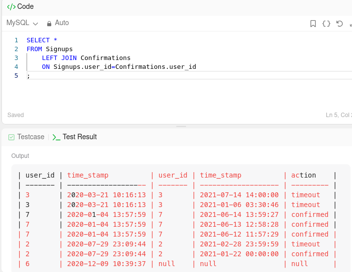처음에 Signups와 Confirmations테이블을 LEFT JOIN하는 과정에서 생긴 user_id 6 데이터가 Confirmations.user_id NULL값을 가지지만 Signups.user_id를 이용하며 COUNT가 된 것이다.