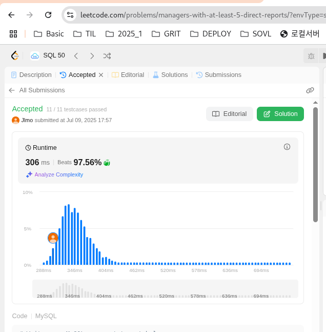 동등 조인과 id=manager에 해당하게끔 하여 매니저 정보를 뽑은 뒤, GROUP BY를 이용해 COUNT한 수를 WHERE에 이용해야하는데, SELECT문에 사용한 COUNT를 WHERE에 다시 사용할 수가 없어서 고민이다.. 우선 TDD 처럼 매니저가 가지는 직속부하 수를 확인하는 코드 없이 작성해서 제출해보았다.