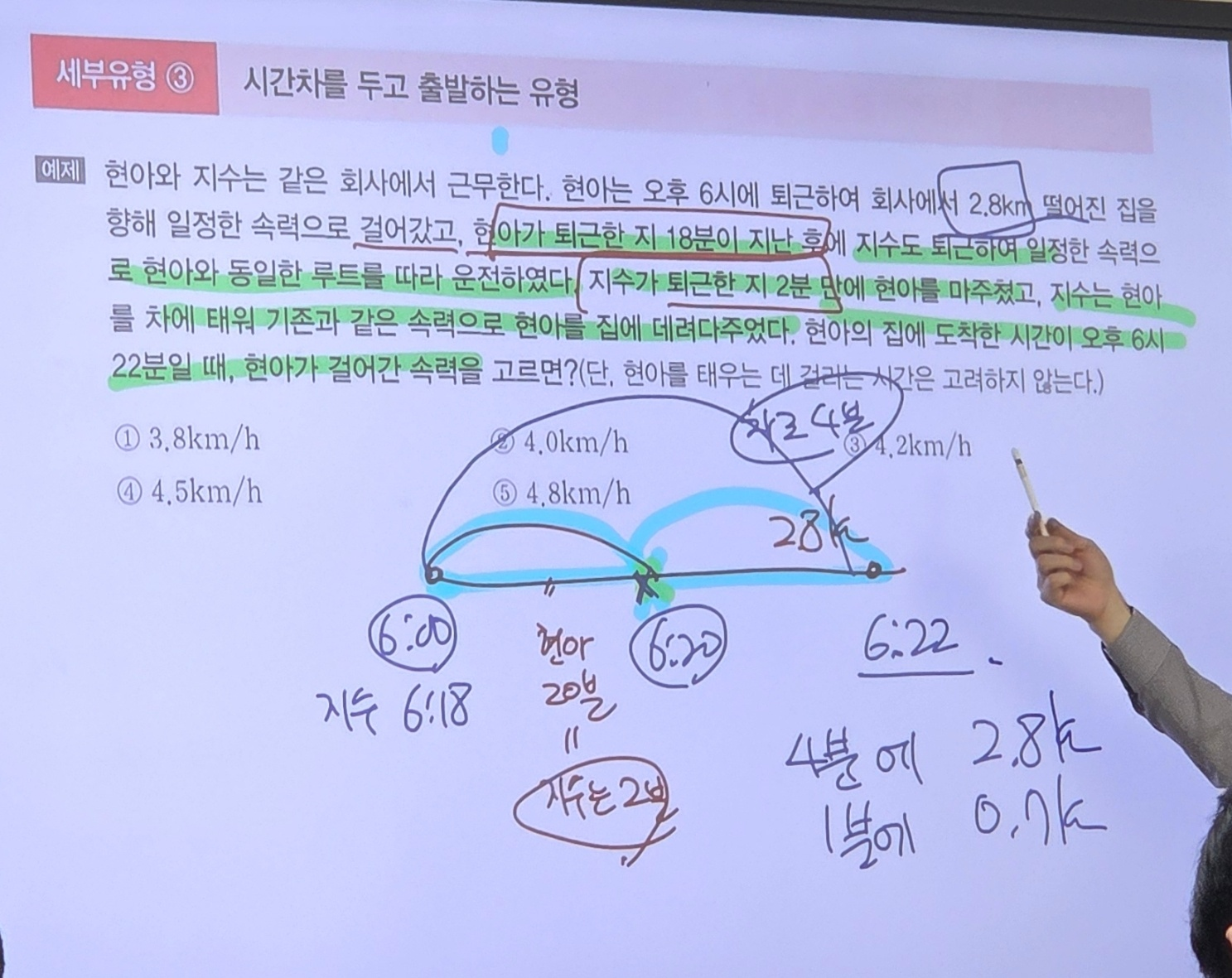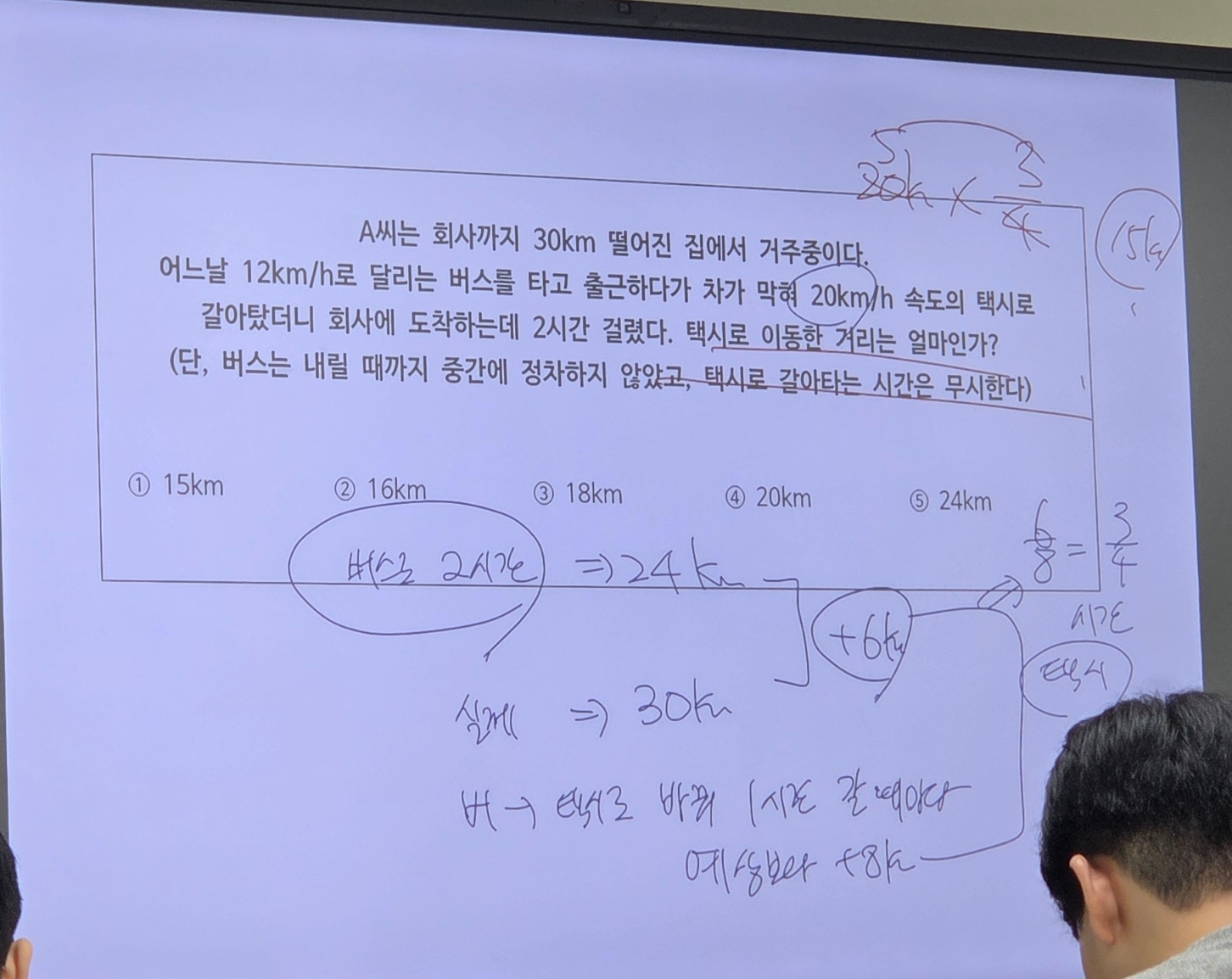 버스로만 2시간 가면 24km, 속도차는 8km/h, 30km로 맞추려면 3/4시간만큼 택시.