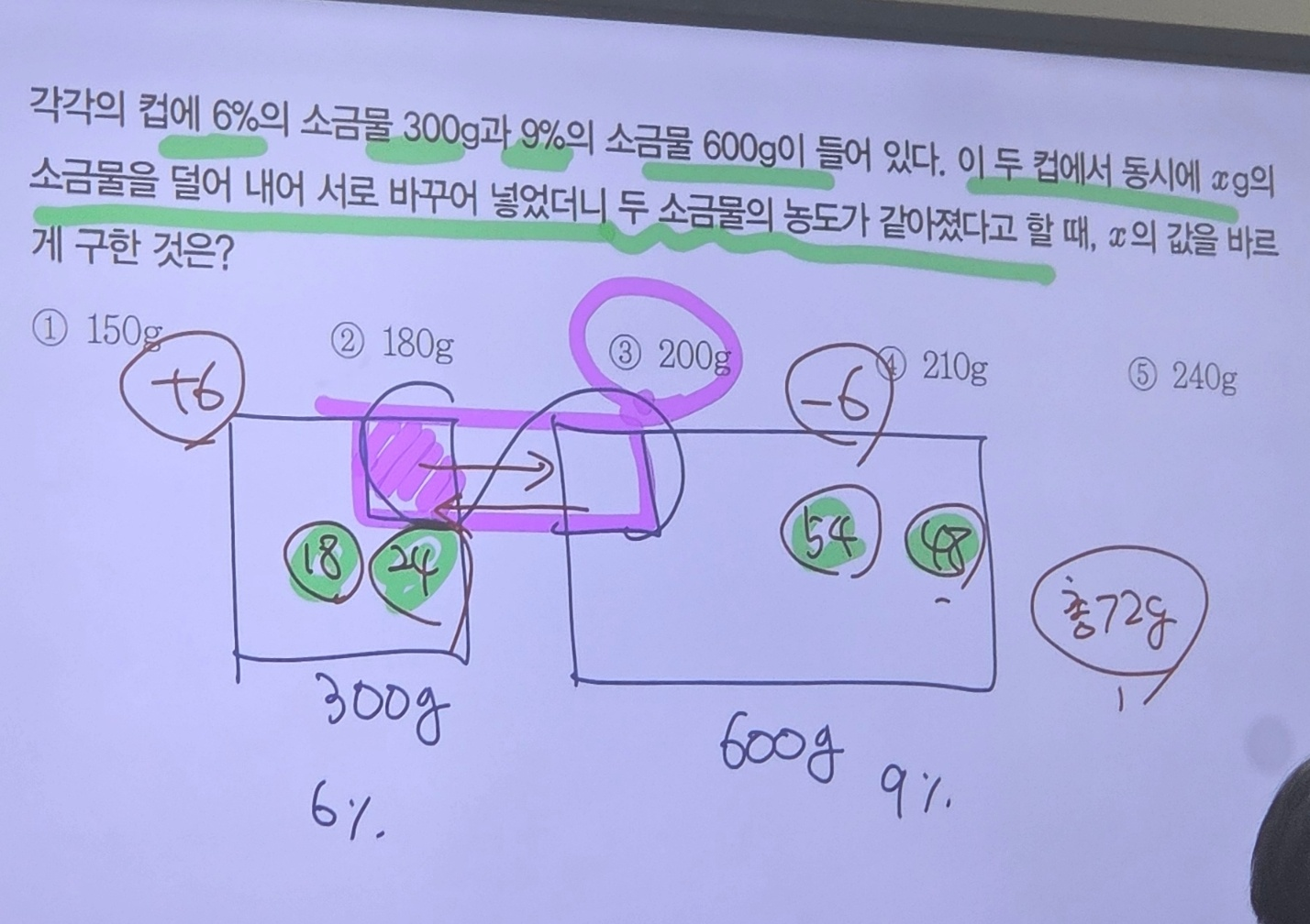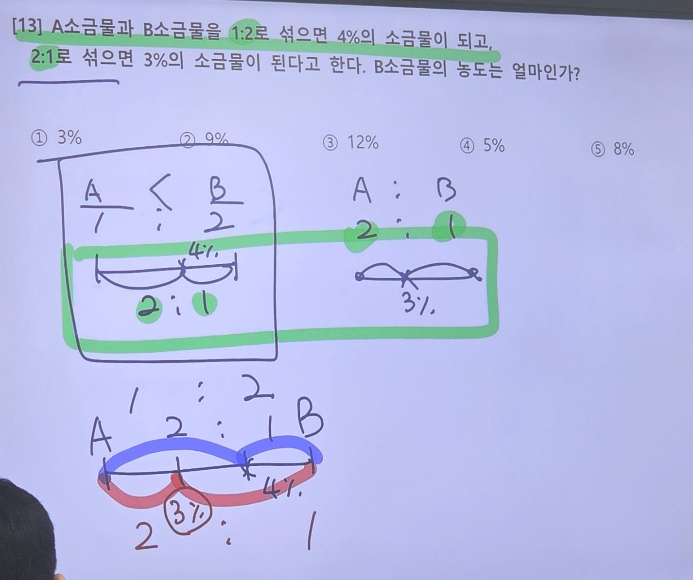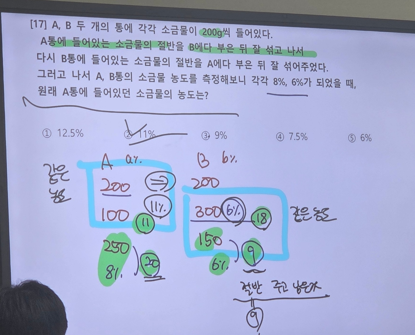 각 과정별 물 g을 먼저 찾고, 주는 쪽은 농도가 안바뀜. 그거 따라서 소금 양 타고타고 올라가면 초기 농도를 알 수 있음 다시 풀어보기. 다시 풀면 못풀듯