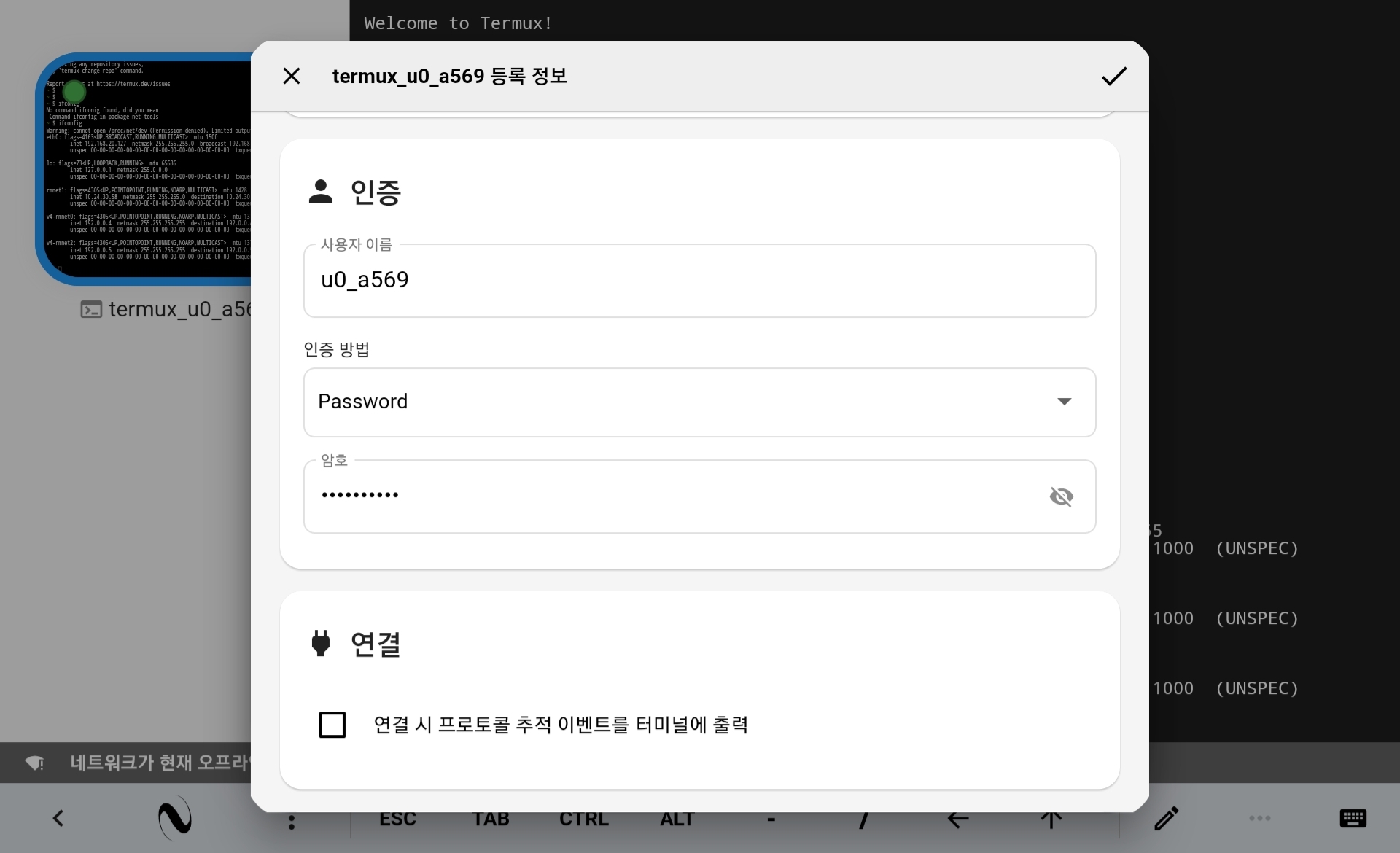 위 그림과 같이 setting을 통해서 ssh 접속은 가능했다.(그전에 host(스마트폰에서 'sshd'라고 명령하여 ssh를 실행해둔 상태)