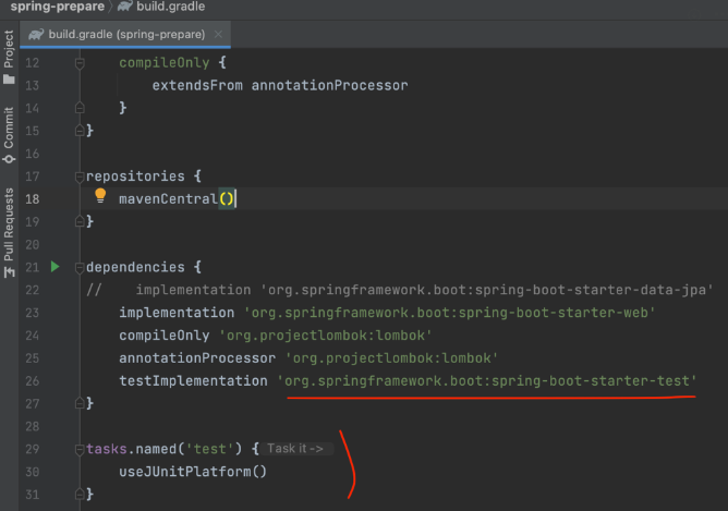 - build.gradle 파일을 열어보면 JUnit 사용을 위한 환경설정이 이미 되어있습니다.
