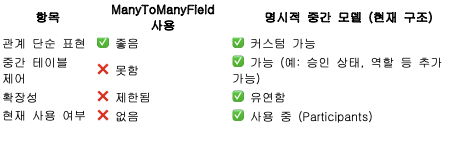 • 향후 Participants 모델에 추가 필드가 들어올 가능성 있음 (예: 참여 승인 여부, 상태 등)