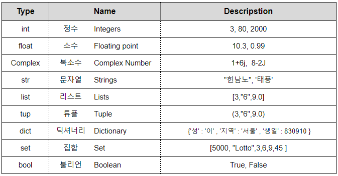 해당 강의에서는 자세한 설명보다는 간단하게 이런 데이터 타입이 있다