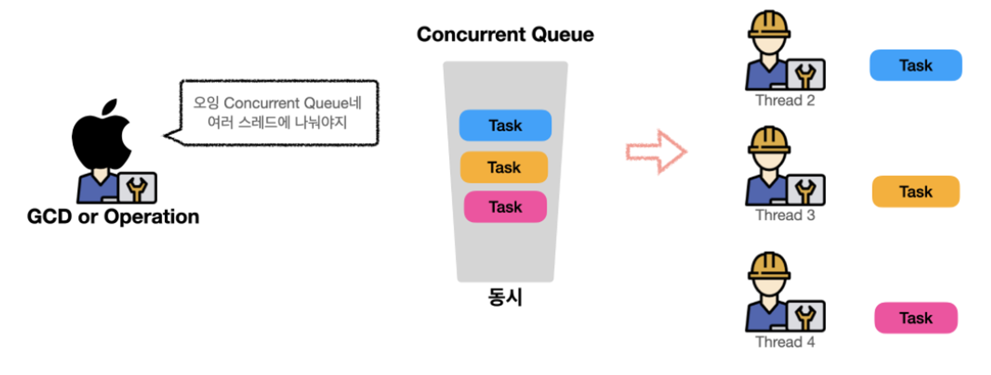 - GCD는 concurrent queue에 담긴 작업을 여러 스레드에 분배한다.