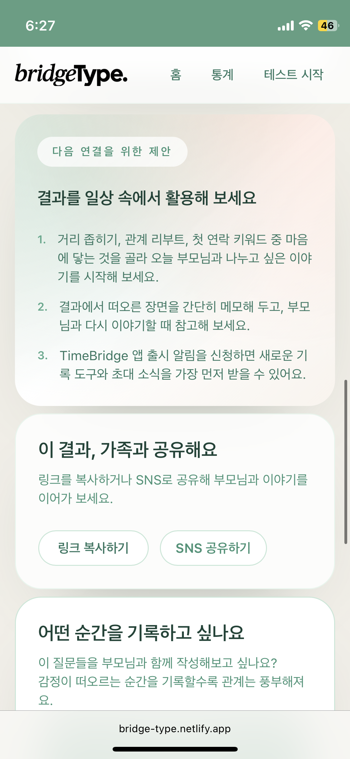 결과 페이지는 미리 정의된 데이터 구조 안에서 입력값을 매핑하는 단순한 형태로 구현했다. 이 방식이 제한된 일정 안에 프로젝트를 완성하는 데 효율적이었고, 향후 실제 AI 모델을 연동하여 실험하기 위한 기반으로도 충분했다. 과거 AI를 활용해 답변을 생성했을 때 다소 동떨어진 결과가 나오던 경험과 토큰 비용, 개발 기간을 종합적으로 고려했을 때 간단한 매핑 방식이 가장 합리적인 선택이라고 생각했다.