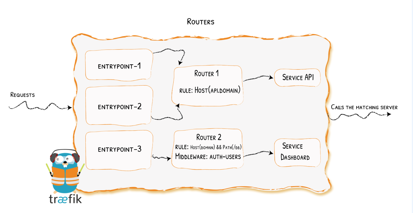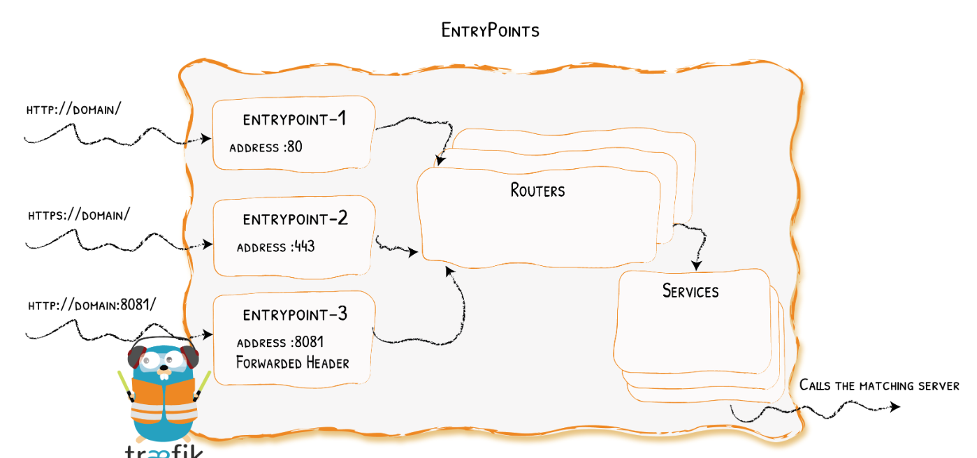 Traefik은 EntryPoints, Routers, Middlewares, 그리고 Services 개념을 기반으로 합니다.