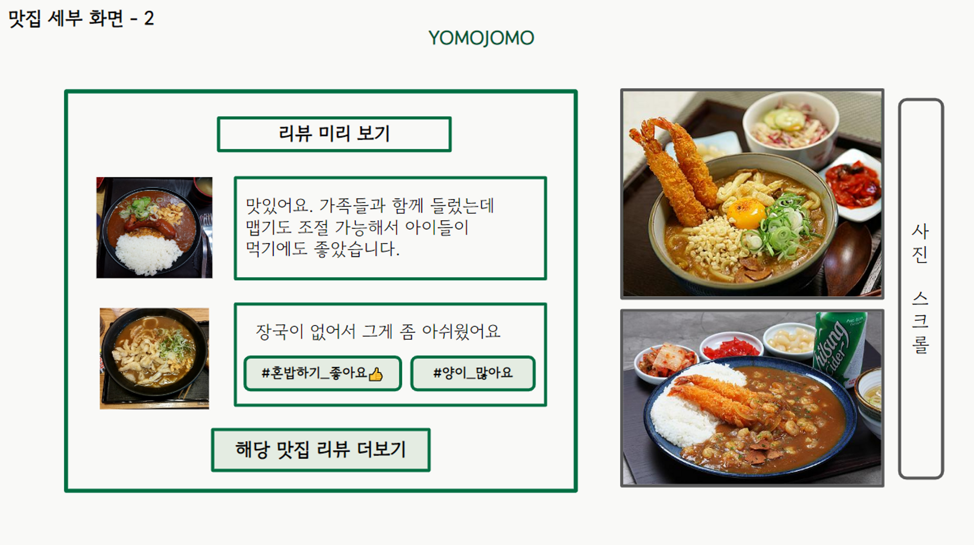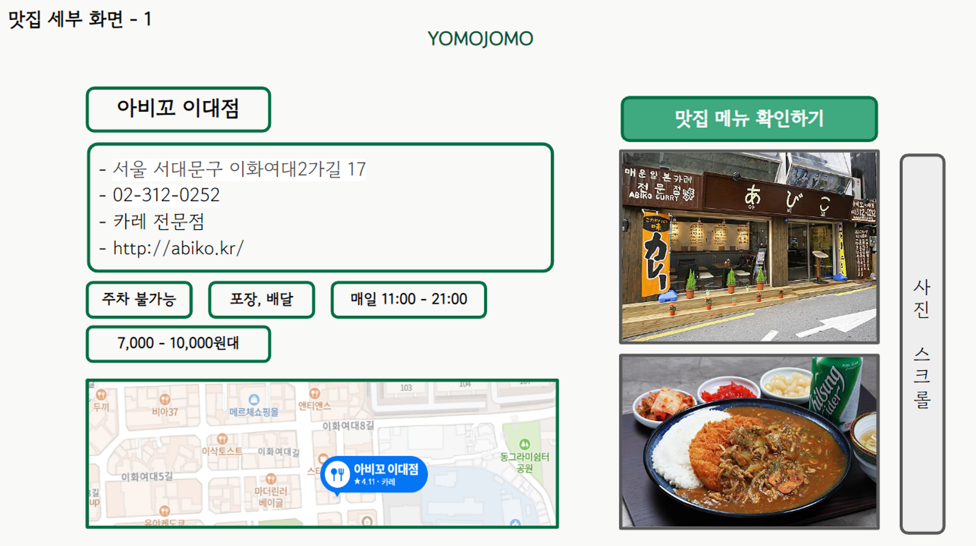 ㅤ상세히 보면 화면 우측에는 맛집 메뉴 미리보기 창(사진만 표시)과 맛집 메뉴 화면으로 연결된 버튼을, 화면 좌측에는 가게 관련 상세 내용(가격, 주소, 전화번호 등)과 미니맵, 그리고 리뷰 미리보기 창(작은 사이즈로 표시)을 배치하기로 했다.